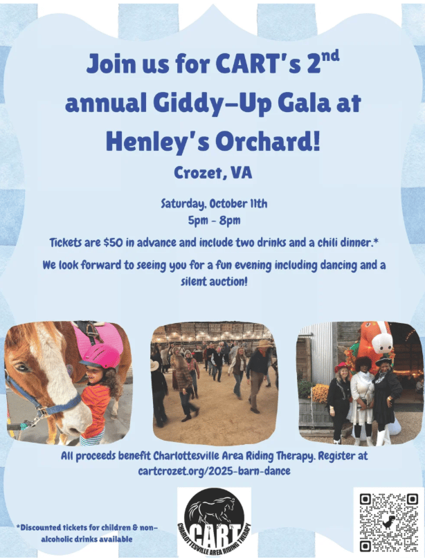 CART to host its 2nd Annual “Giddy Up Gala” - Based in Crozet, Charlottesville Area Riding Therapy (CART) is a non-profit that provides therapeutic recreational horseback riding to children and adults with special needs.