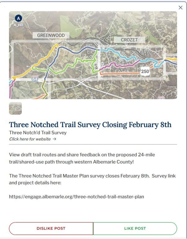 2026 Property Tax Assessment Update - Albemarle County’s 2026 property assessments are going up. In White Hall, residents will likely see increases in the range of 5%. Official assessment notices were mailed in late January, and while the final tax rate won't be set until April, these higher valuations mean most homeowners should expect an increase in their tax bills this May. Read more at →CBS19