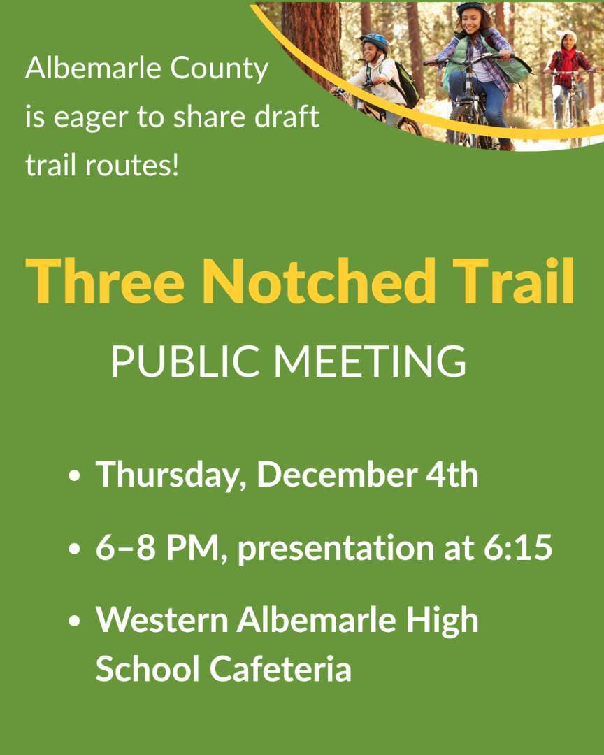 Over the river and thru the woods - Find out where the County is planning to put the much anticipated walking and biking trail that will connect Crozet to Charlottesville. The public meeting is tomorrow at 6:00PM at the WAHS Cafeteria. This is your opportunity to give input!