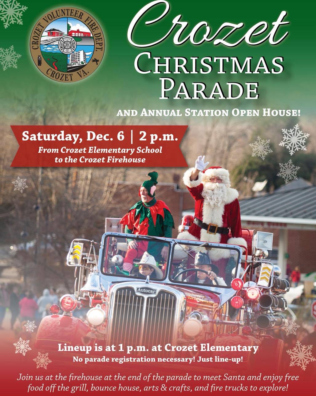 – Crozet Christmas Parade | Crozet Volunteer Fire Department | 2:00 PM | FREE - Parade starts at Crozet Elementary. Afterward, visit the firehouse for Santa, bounce houses, free hotdogs, coffee, and hot chocolate. Chik-fil-A and Sunset Slush available for purchase.