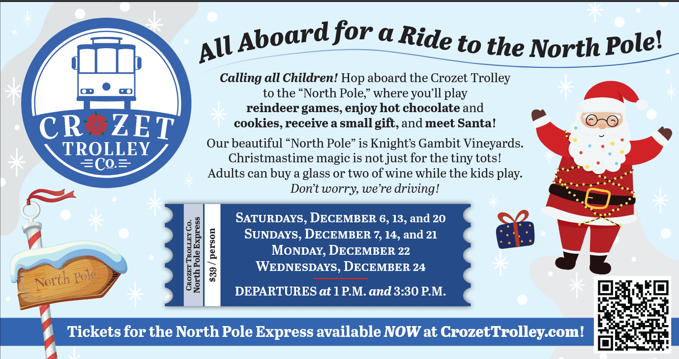 Crozet Trolley’s North Pole Express - Looking for a festive outing close to home? Crozet Trolley is bringing back its North Pole Express, a fun holiday ride that starts in Downtown Crozet and winds its way to Knight’s Gambit Vineyards—transformed for the season into a cozy “North Pole” stop. Kids can sip hot chocolate, play a few holiday games, and say hello to Santa, while adults enjoy the chance to take in the vineyard views (and maybe a glass of wine) without worrying about the drive. It’s a simple, charming way to add a little magic to December, and seats tend to go quickly each year.
