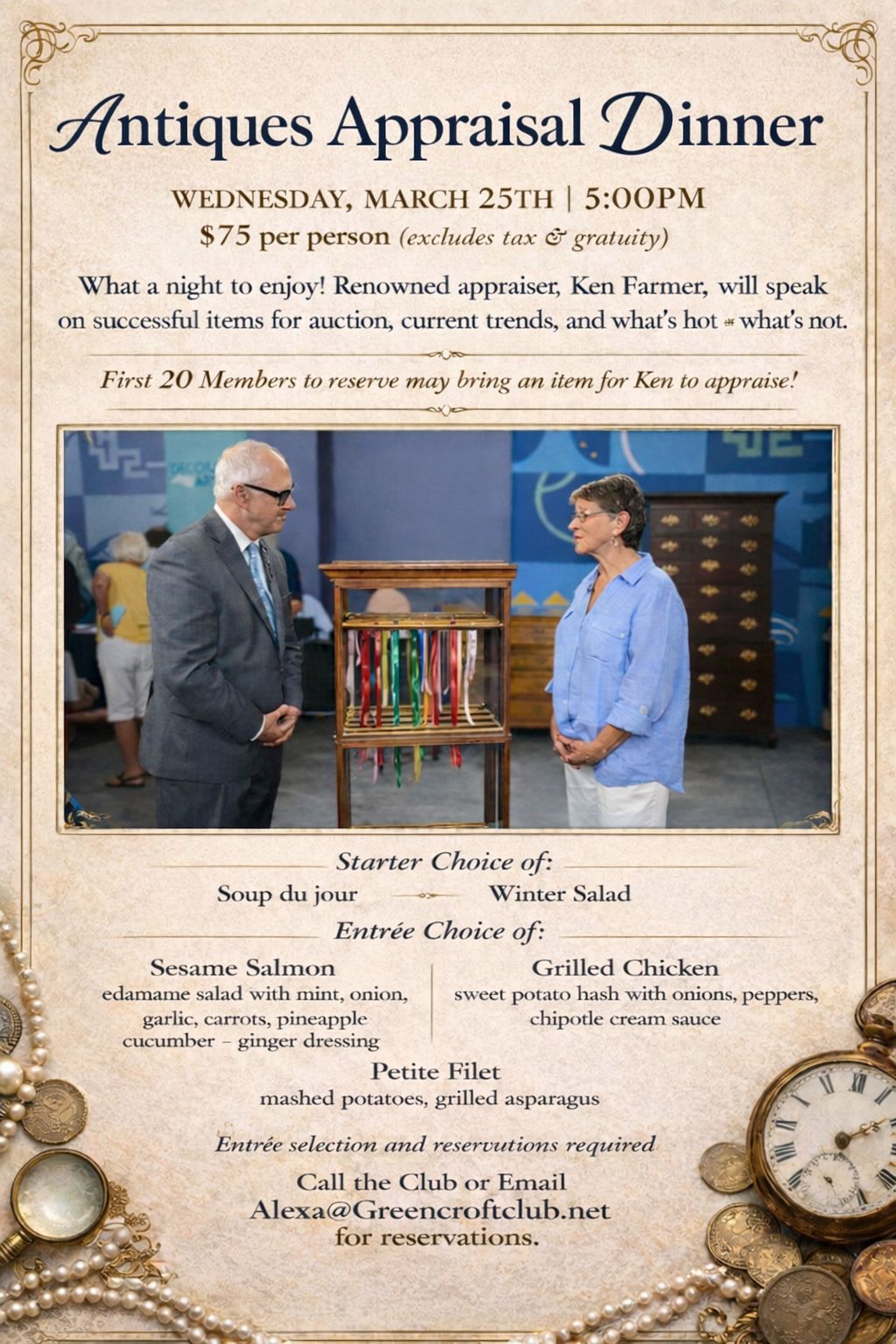 Looking for something unique to do tonight? The Greencroft Club is opening its doors to the public for its Antique Appraisal Dinner tonight, Wednesday March 25th at 5:00 - 8:00 PM. Tickets are $75 per person and you’ll need to make advance reservations and entree selections by emailing [email protected].