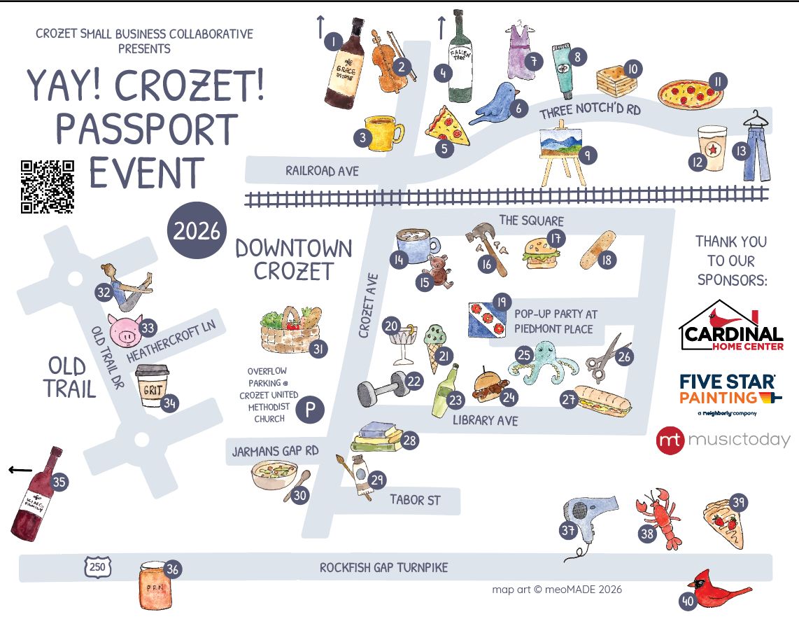 The 3rd Annual "Yay! Crozet!" Passport Event - Explore around Crozet on Saturday, April 18, during the third annual "Yay! Crozet!" event. This community-wide "treasure hunt" invites you to visit local boutiques, vineyards, and cafes while discovering local makers at the Community Corner in Piedmont Place. Organized by the Crozet Small Business Collaborative, the event is a fun, free way to support the local economy and win prizes from your favorite merchants.